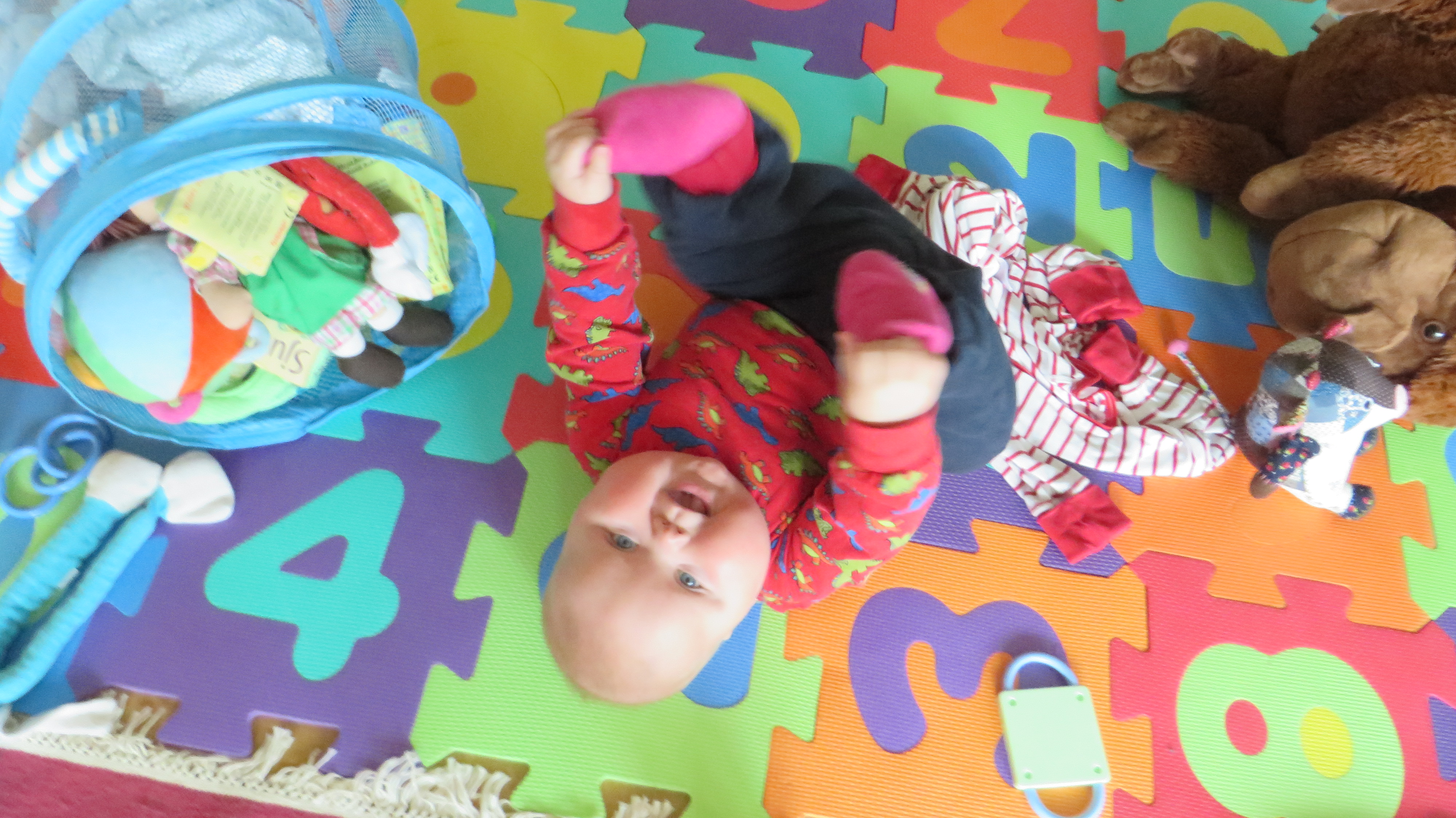 Det bästa Signe vet när hon ligger sådär omgjordad är att sticka in händerna alldeles lagom kittligt i antingen mammas eller pappas armhåla. Eftersom hon dessutom uppenbarligen utvecklat teleskoparmar så har hon med tiden optimerat tekniken och kan få in händerna i två armhålor samtidigt, en per alldeles lagom kittlig förälder.